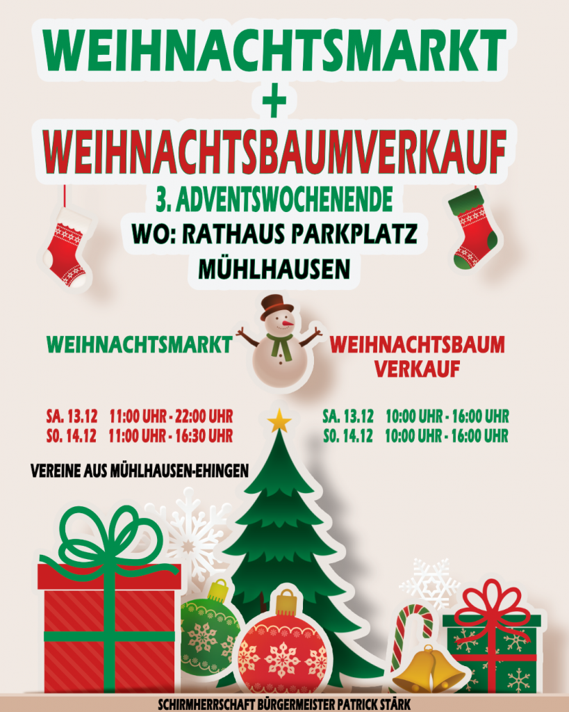 Am dritten Adventswochenende sind wir auch in diesem Jahr mit zwei Ständen auf dem Weihnachtsmarkt in Mühlhausen auf dem Rathausparkplatz vertreten.